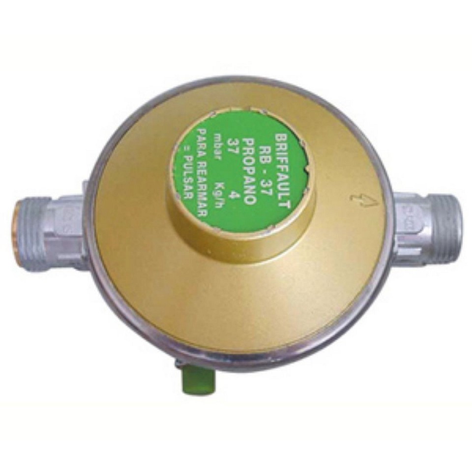 Regulador presión con llave de corte, 30 mbar, válvula seguridad por corte de goma, manómetro visual presión y válvula de alivio